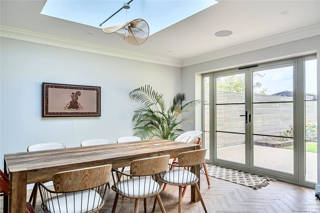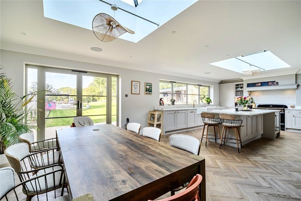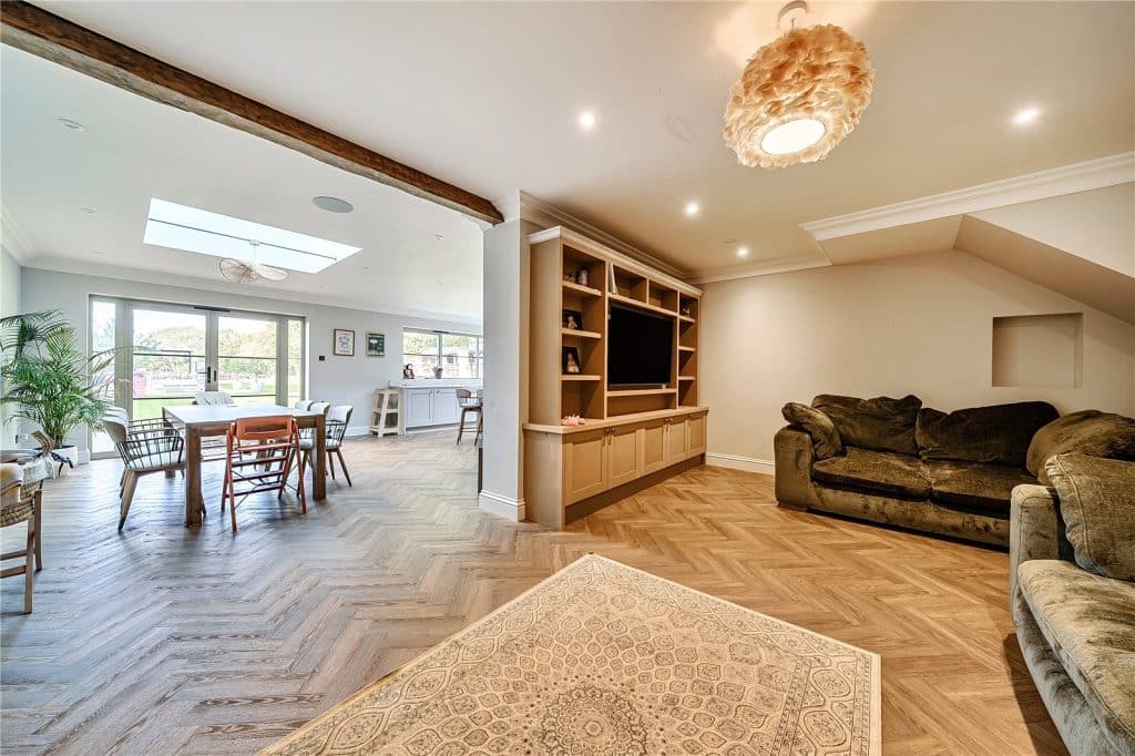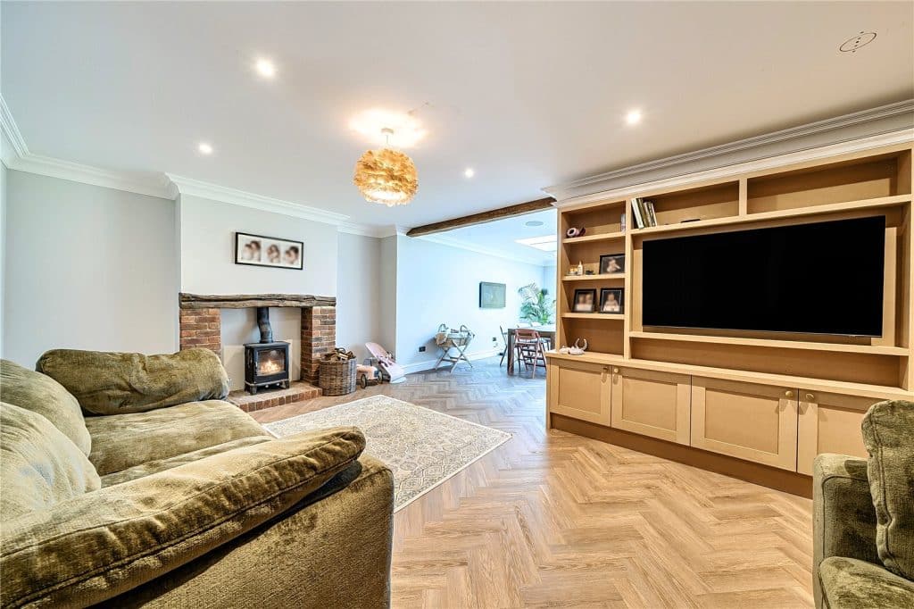 Kitchen/Dining/Family Room An impressive open plan space, attractively fitted with a contemporary range of matching units with work surfaces over, and sink unit fitted with a Quooker tap providing hot water, sparkling water and filtered water. There is a feature log burning stove in the family area, whilst double doors lead out to the rear garden in the kitchen/dining area.